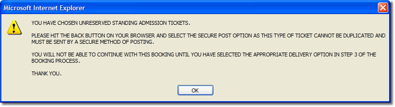 I wrote previously about how white space is just as important in good user interface design as the content itself. Whilst booking some concert tickets recently using the TicketMaster website, I came across another example of bad design. In this case all I had done was opt for standing tickets to be sent to me via normal post (not registered delivery). This is what happened: