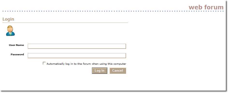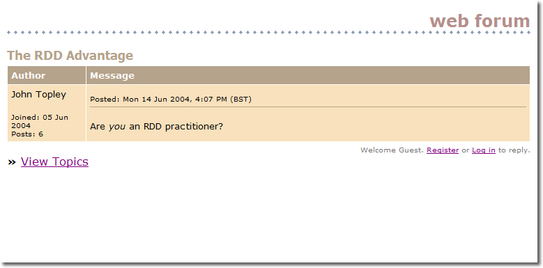 The date and time of the post are displayed, as well as the author's name, the date they registered with the system and the number of posts they've made. The user can register if they are a new user, or log in if they are an existing user. A user must be logged in before they can create a new topic or a new reply. They can elect to automatically log in during registration or at the Login screen: