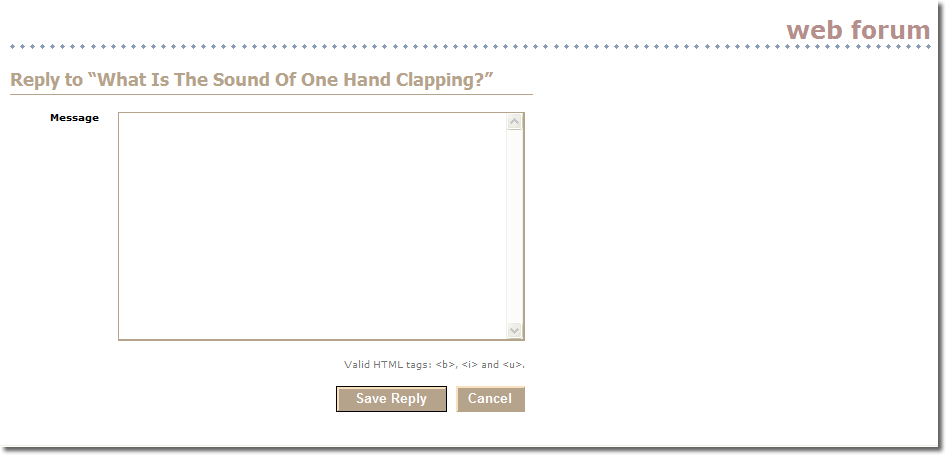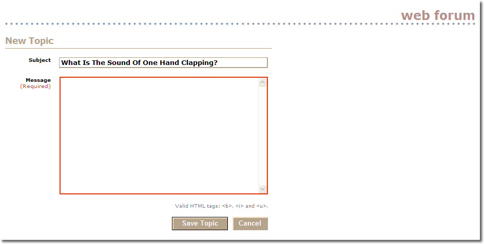 Both the subject and message fields are mandatory. They are allowed to use the HTML <b>, <i> or <u> tags for basic text variations (bold, italic or underline) in the message field. Once they have created a new topic they are taken back to the Topics screen. The hyperlink to a topic contains an encoding of the number of replies to that topic, which ensures that the user can see which topics they have read, because the hyperlinks to those topics are displayed using the browser's visited link colour. Therefore, new replies to a topic cause that topic's hyperlink to be displayed using the browser's unvisited colour. Thanks to Joel Spolsky for this brilliantly simple idea.