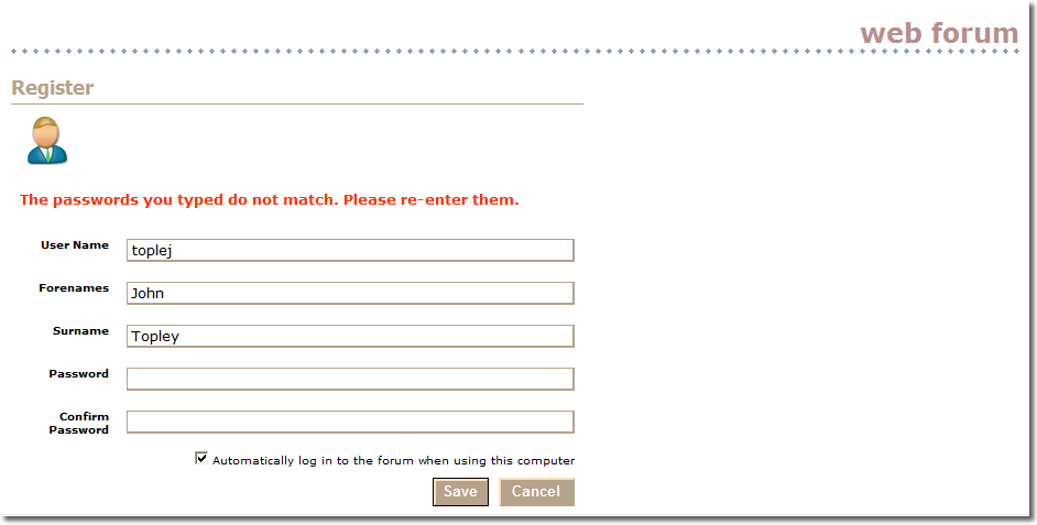 The auto-log in feature uses a cookie that expires after thirty days. During registration they must provide a unique user name, their real name (or screen alias) and a password. All of these fields are mandatory apart from surname and they must confirm their chosen password by entering it twice: