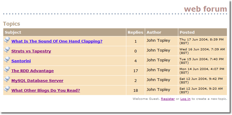 I'm now going to give a brief tour of the Web Forum's functionality. Some of this I'd thought about before I wrote a line of code, other aspects become apparent as I was building it. It helped that there are plently of existing forums to serve as inspiration!