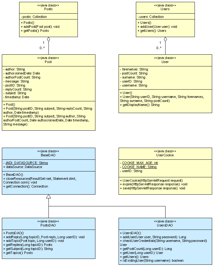 —Some of these classes—such as UserCookie—will be covered later in the series. As can be seen from the class model, a Posts class contains a collection of Post objects at runtime, and features methods for retrieving this collection and for adding a new post. The Post class itself has attributes corresponding to the columns in the posts table, and overloaded constructors which are invoked depending upon whether the post is a topic or a reply. Accessors and mutators (getters and setters) are not shown on the class model.