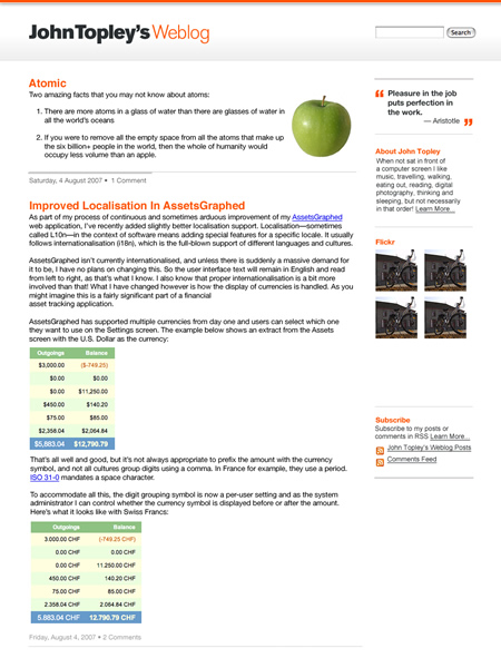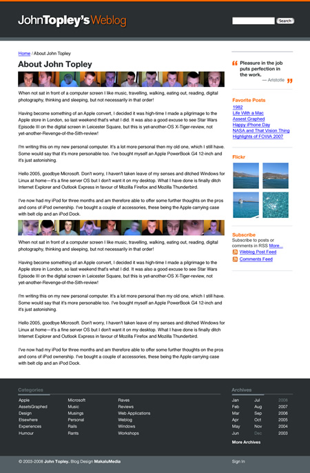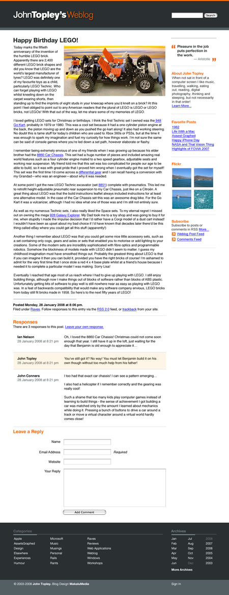 This is a post that I've been waiting to write for a long time. I have spent what at times has seemed like forever developing a new blog application in my spare time to run my website on. You're looking at the result. I was motivated to do this for several reasons. First and foremost, I've never been entirely happy with the appearance of the second version of my blog. I was happy with the first version which ran from 2003 until 2005 which I designed myself, but I hacked together the look of its successor rather quickly. So I wanted to actually pay a professional designer to kick the aesthetics up a notch.