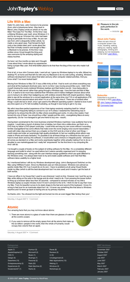 Secondly, I've grown disatisified with WordPress as a blogging platform. Now WordPress is a fine application and to be fair, the latest versions are considerably more polished than the version I started out with back in 2006, but it wasn’t a good fit for the way I write posts. Things probably came to a head when I spent a long time fighting against WordPress with the code listings in Installing Mint On A Rails Machine. I needed something that better fitted my blogging requirements, something that would fit me like a glove if you will. That meant a bespoke solution was called for.