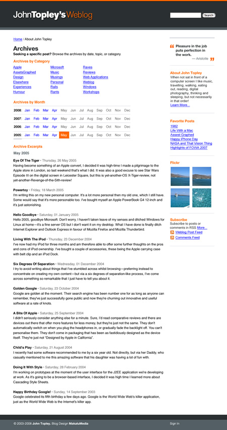—The Archives page resurrects the idea of having excerpts from each post, which was a feature that I liked from my original blog. It also introduced breadcrumb links to make site navigation easier.