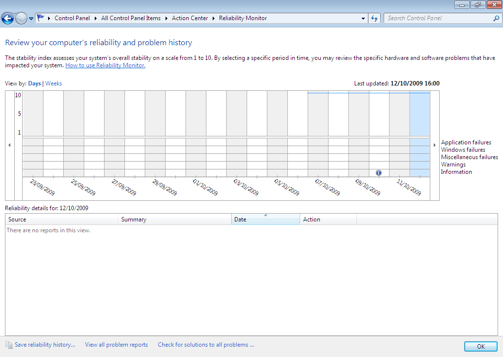 I'm sure years of jibes about the unreliability of Windows must have hurt if you work at Microsoft, but I can’t help thinking that it’s a bit geeky and quite frankly anal to include an application that lets you monitor and graph your PC’s reliability or lack thereof, but Windows 7 does include a Reliability Monitor (click to enlarge):